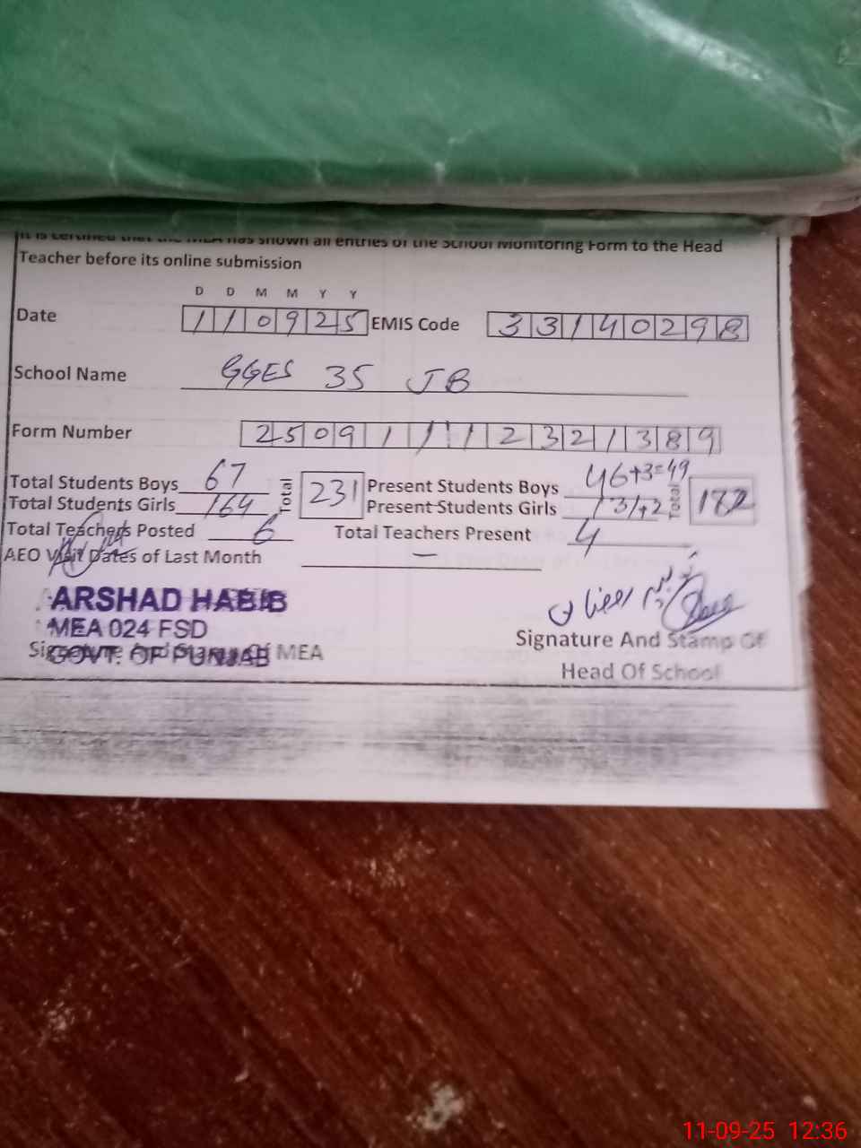 | EMIS Code: 33140298 | Name of School: GGES CHAK NO 35 JB | |||
