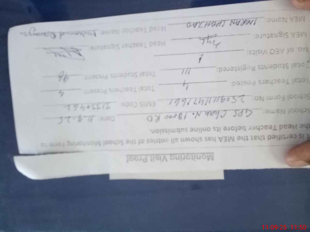 | Attendance Register | Head Teacher | MEA with School | Visit Proof |