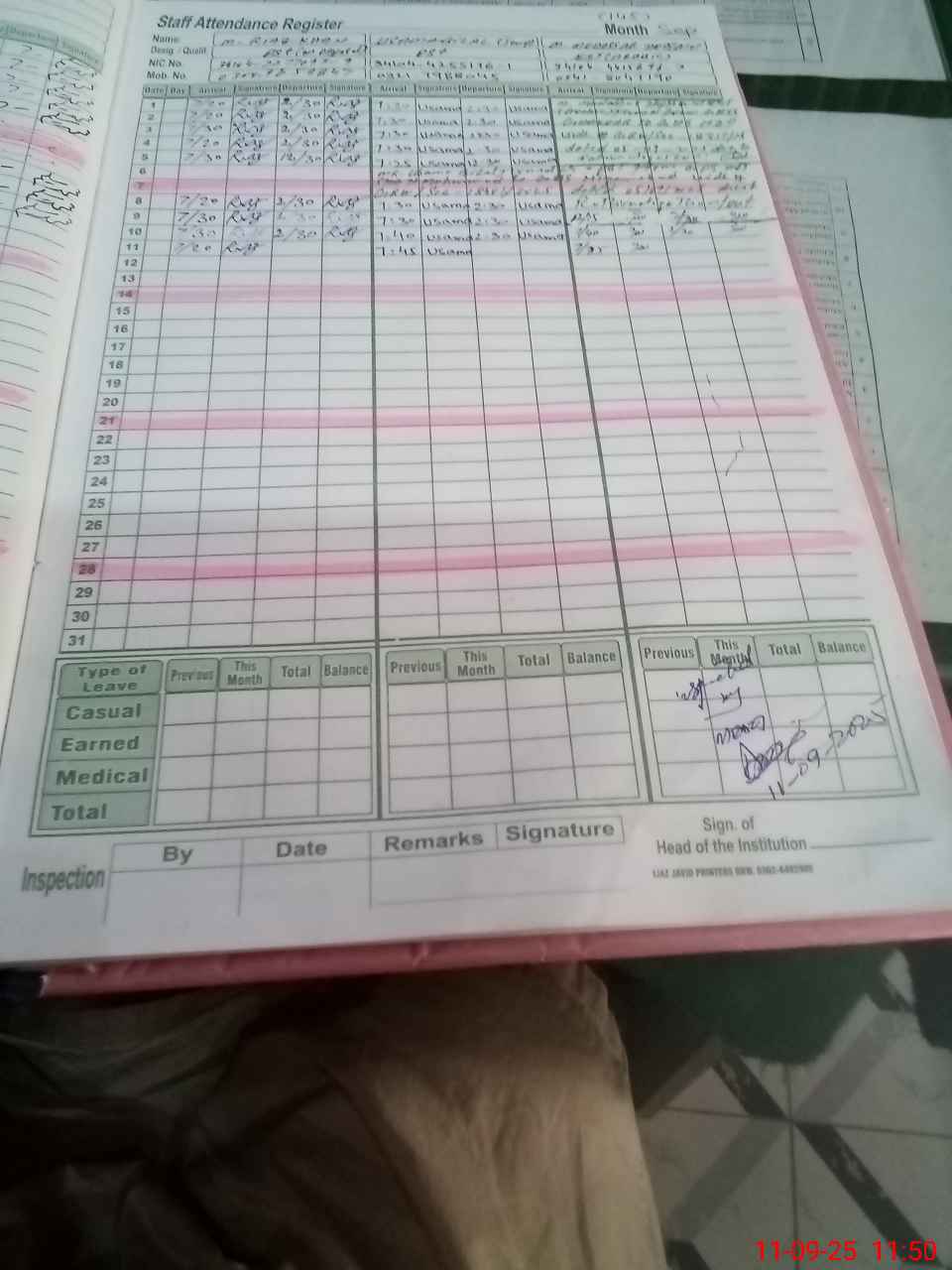 | CNIC | Full Name | Designation | R/C | Absence During Last Calender Month |