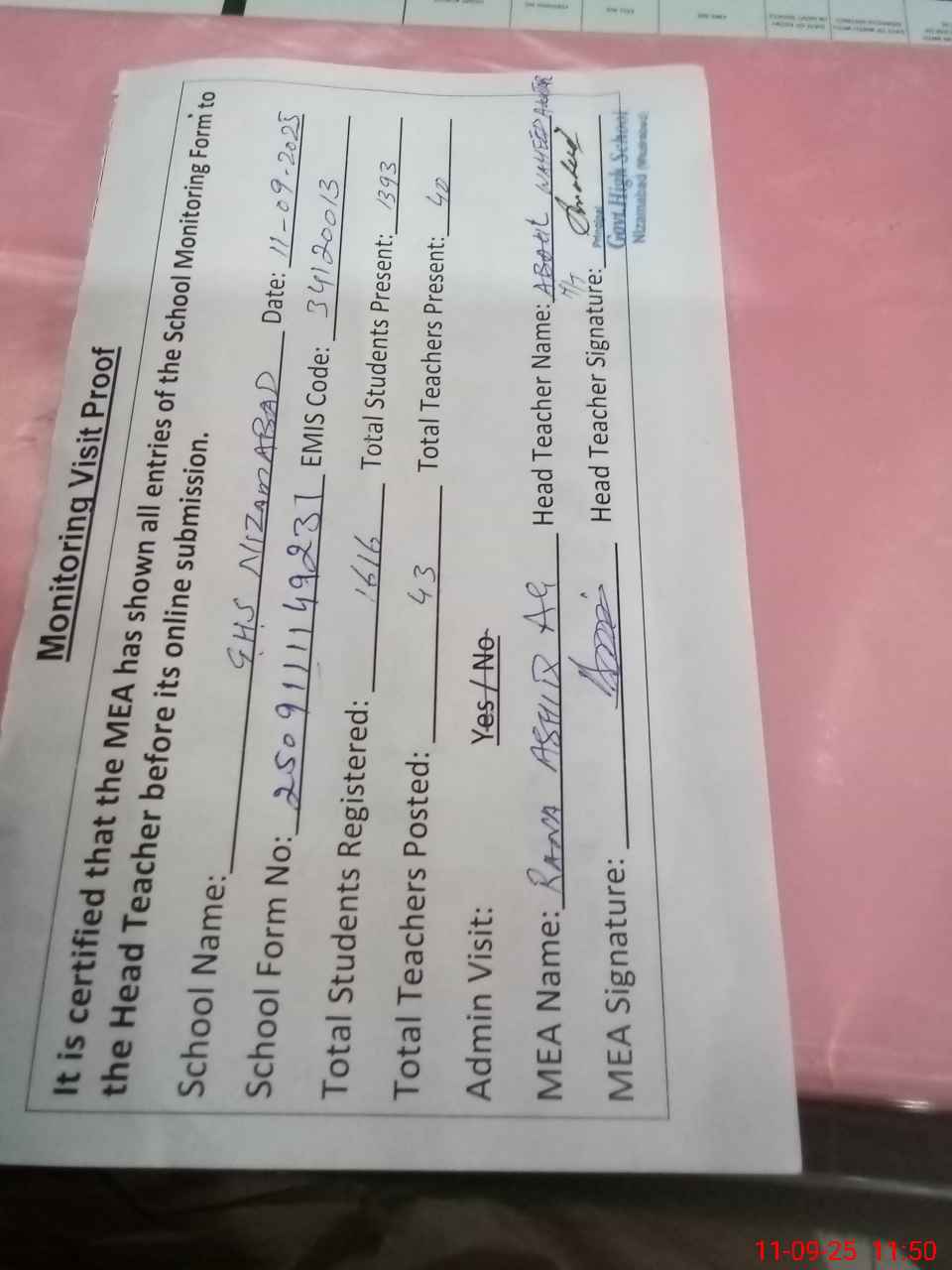 | Attendance Register | Head Teacher | MEA with School | Visit Proof |