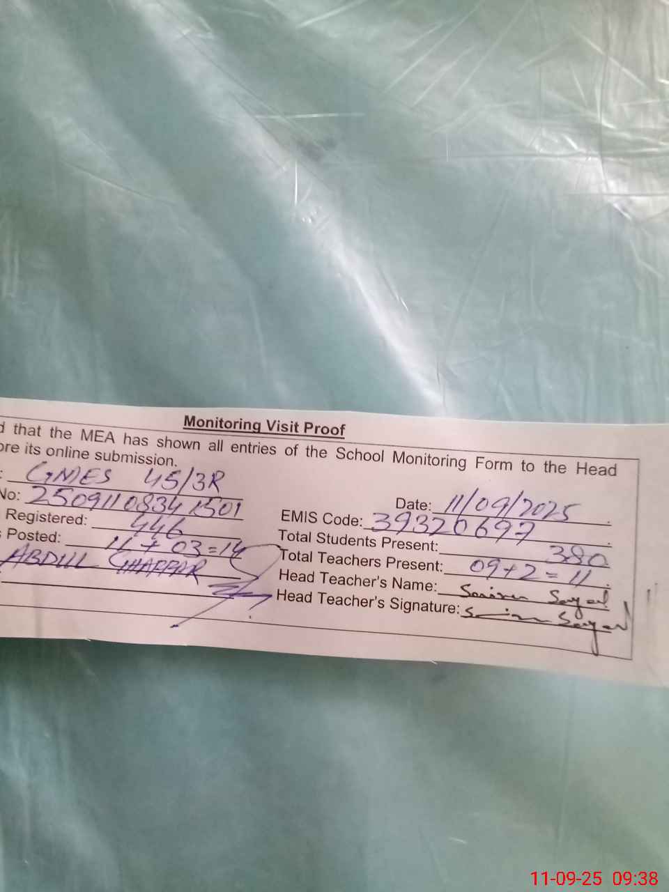 | Attendance Register | Head Teacher | MEA with School | Visit Proof |