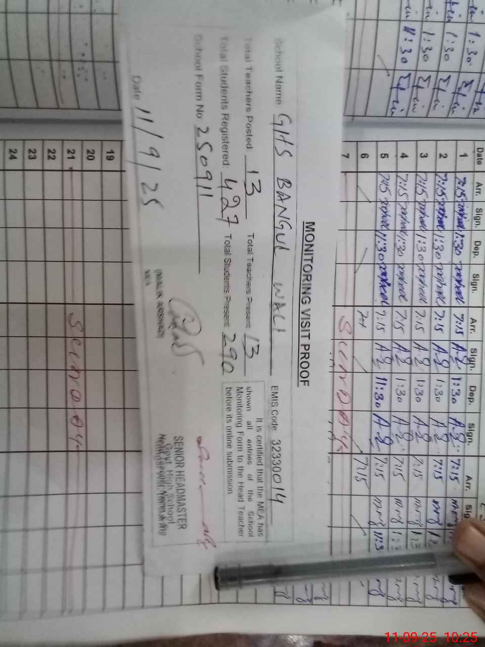 | Monitoring Date: 11-09-2025 | Start Time: 11-09-2025 09:52 AM | End Time: 11-09-2025 10:47 AM | Name of MEA: AR**** PE**** | |