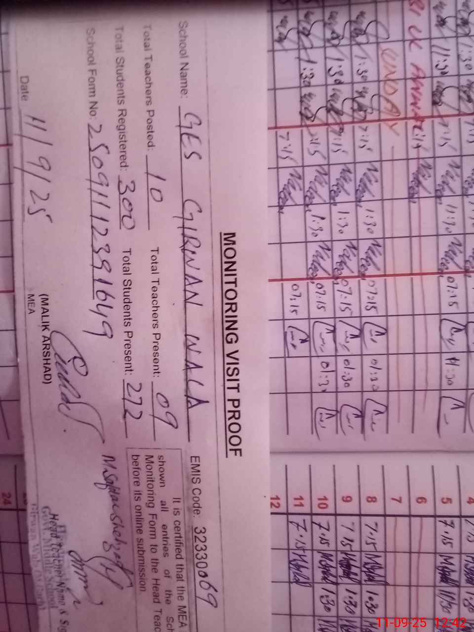 | Attendance Register | Head Teacher | MEA with School | Visit Proof |