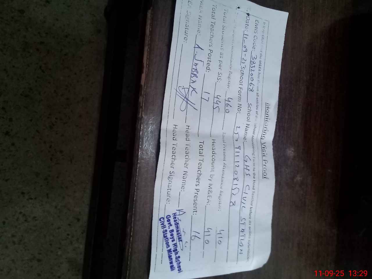| Attendance Register | Head Teacher | MEA with School | Visit Proof |