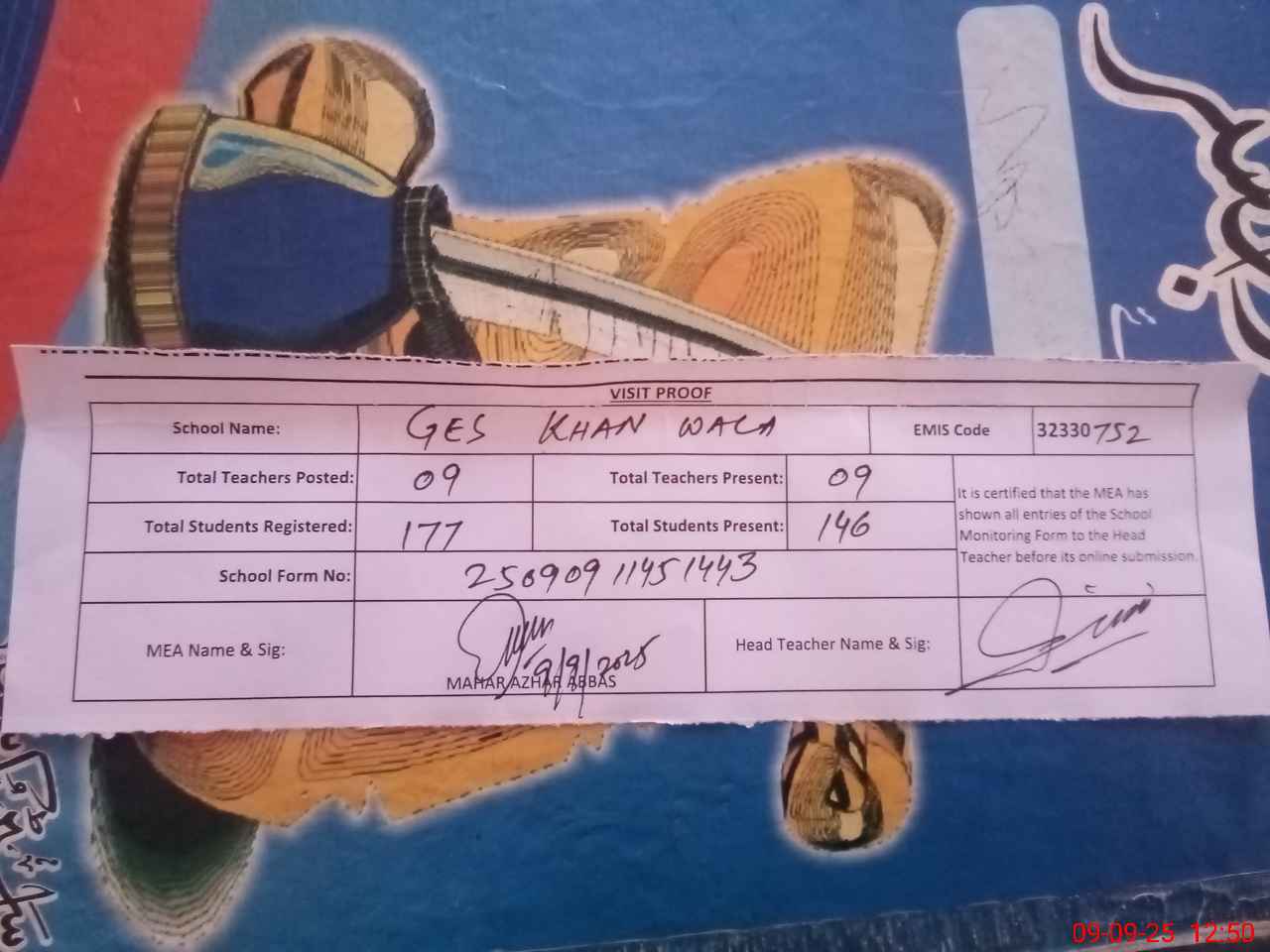 | Attendance Register | Head Teacher | MEA with School | Visit Proof |