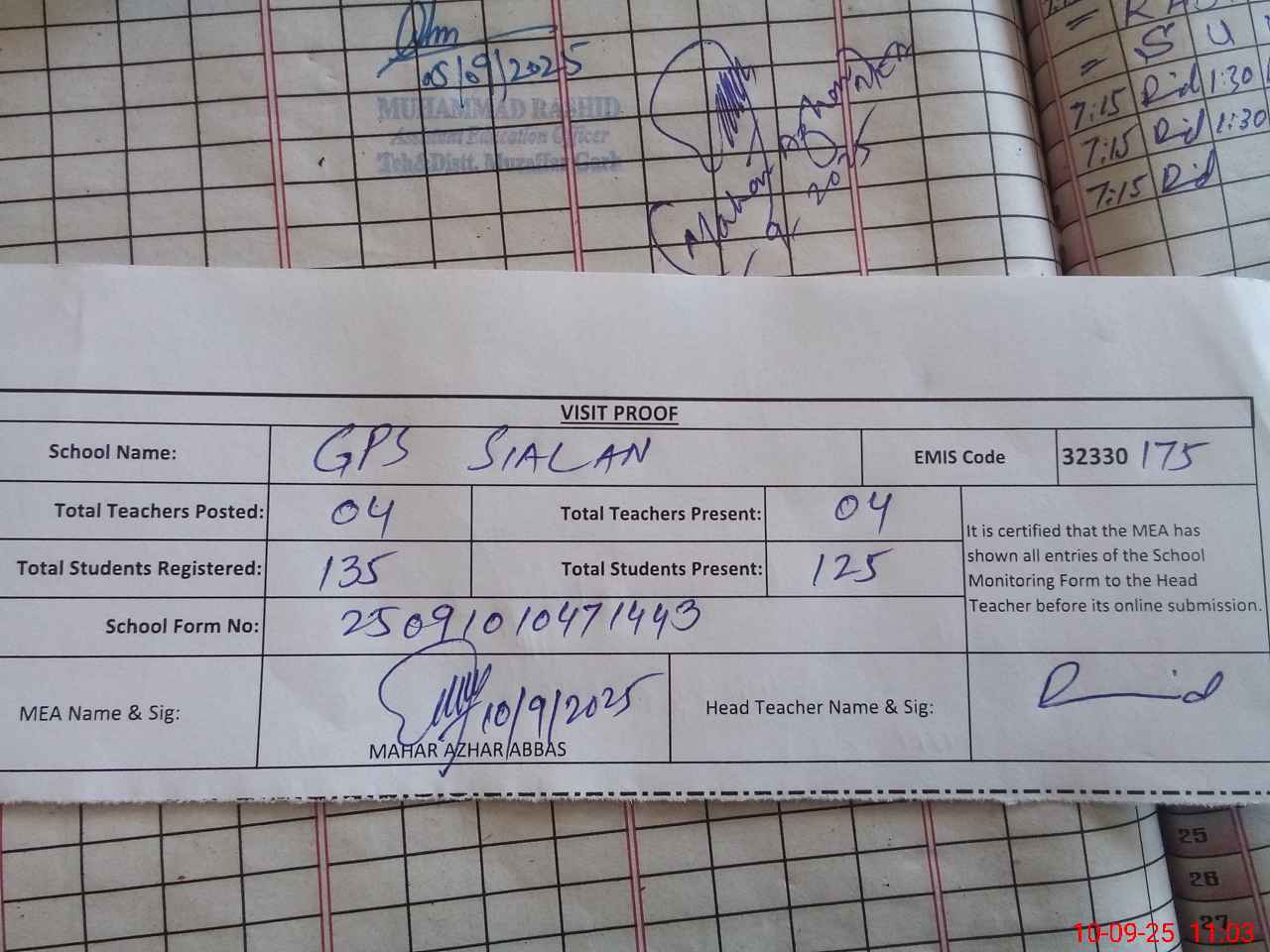 | Attendance Register | Head Teacher | MEA with School | Visit Proof |