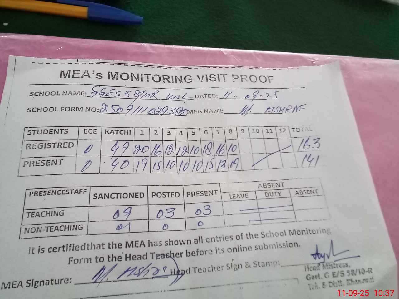 | Attendance Register | Head Teacher | MEA with School | Visit Proof |