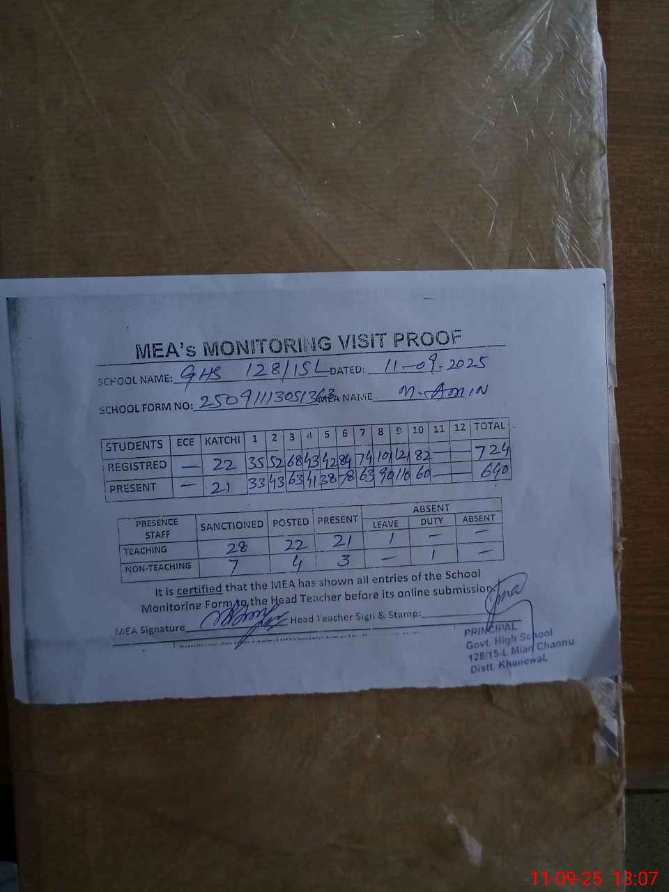 | EMIS Code: 36430015 | Name of School: GHS 128/15-L, MIAN CHANNU | |||