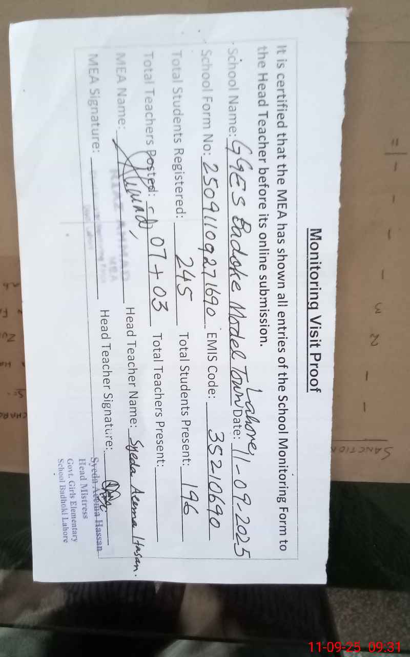 | Attendance Register | Head Teacher | MEA with School | Visit Proof |
