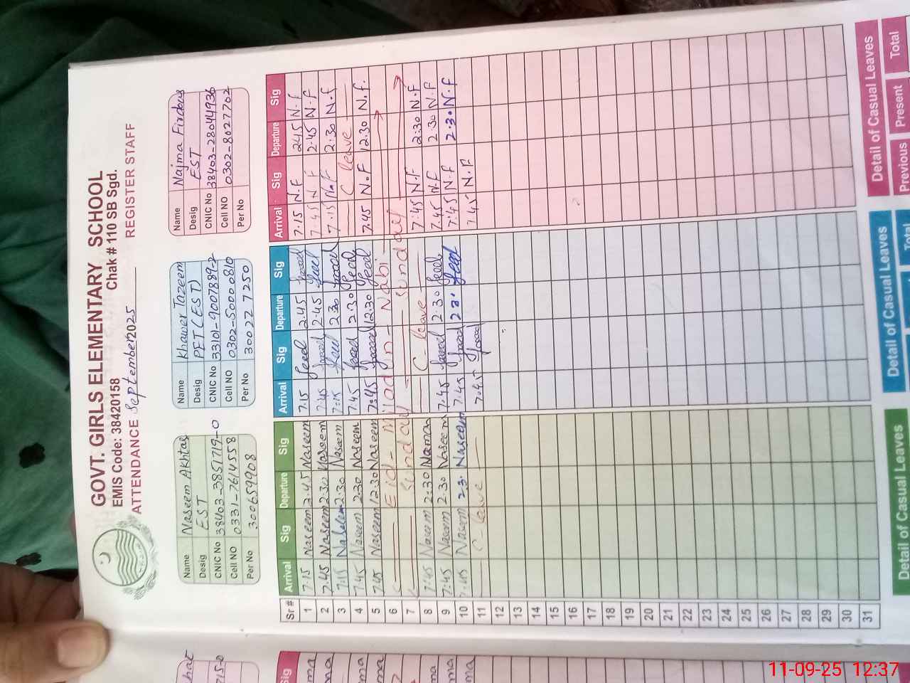 | CNIC | Full Name | Designation | R/C | Absence during last cal. month |