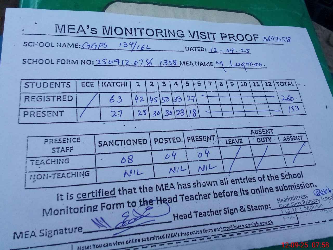 | EMIS Code: 36430518 | Name of School: GGPS CHAK NO. 134/16-L MOHSINWAL | |||