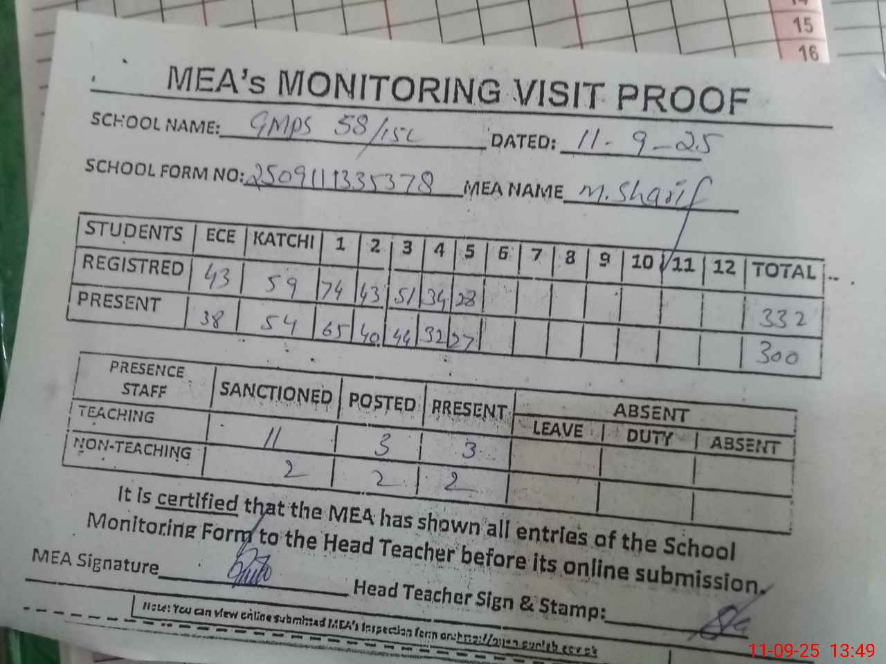 | EMIS Code: 36430323 | Name of School: GMPS 58/15-L, P/O 59/15-L, MIAN CHANNU | |||