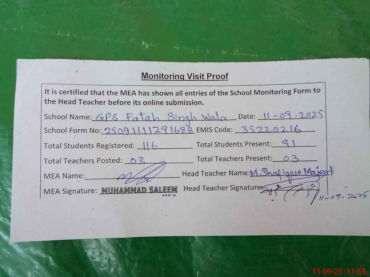 | EMIS Code: 35220216 | Name of School: GPS FATAH SINGH WALA | |||