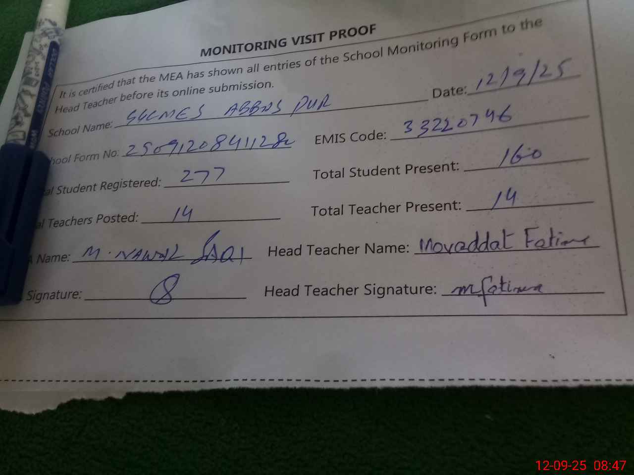 | Attendance Register | Head Teacher | MEA with School | Visit Proof |