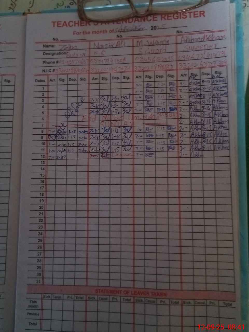 | CNIC | Full Name | Designation | R/C | Absence during last cal. month |