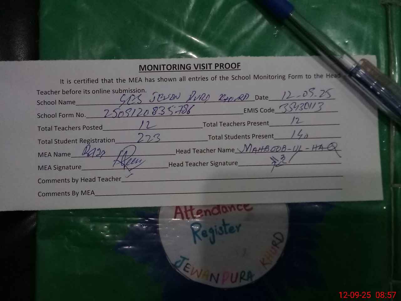 | Attendance Register | Head Teacher | MEA with School | Visit Proof |