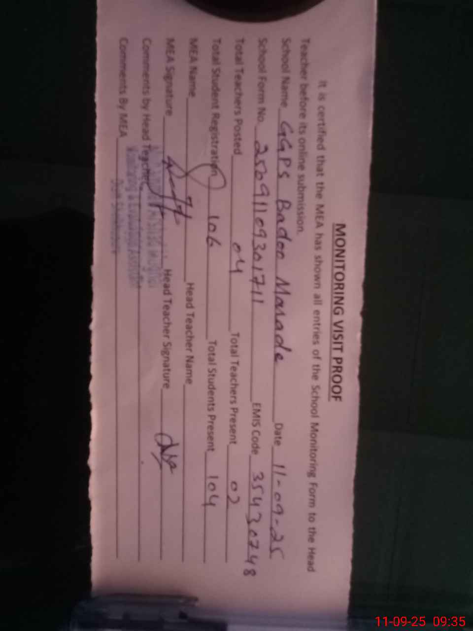 | Attendance Register | Head Teacher | MEA with School | Visit Proof |