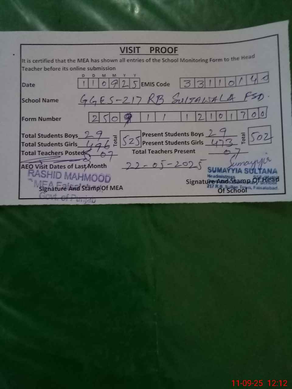 | Attendance Register | Head Teacher | MEA with School | Visit Proof |