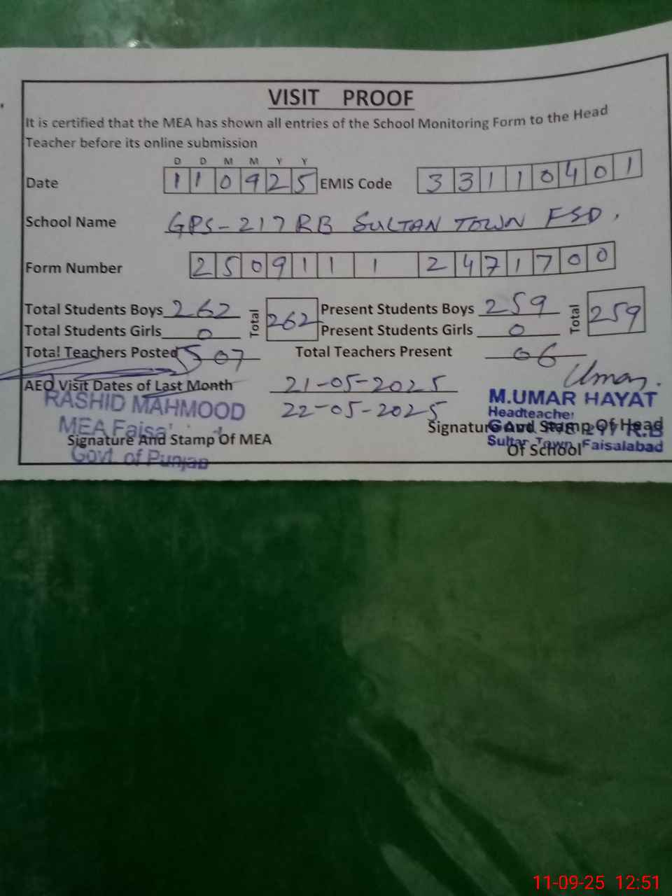| Certified that this School was Inspected by the Undersigned MEA/DMO Today and the Information Stated Above is as Per Record. | |||||