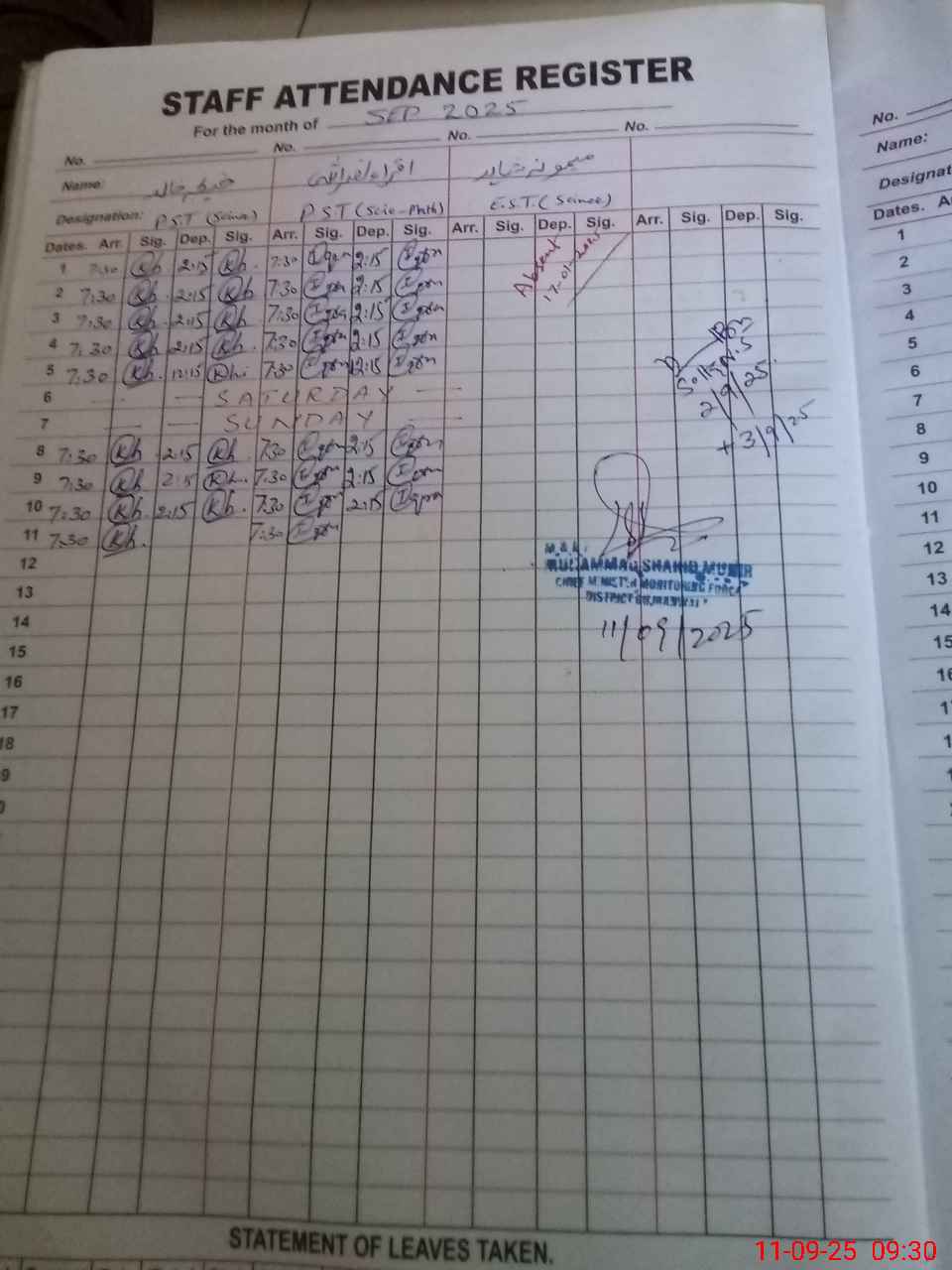 | Monitoring Date: 11-09-2025 | Start Time: 11-09-2025 08:36 AM | End Time: 11-09-2025 09:31 AM | Name of MEA: S-**** Sh**** Mu**** | |