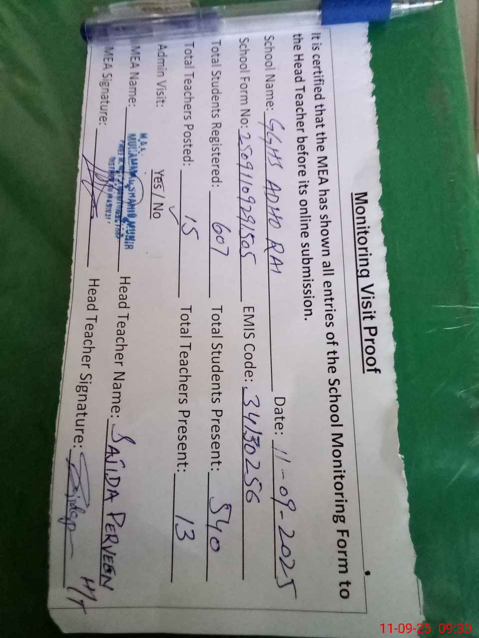 | Attendance Register | Head Teacher | MEA with School | Visit Proof |