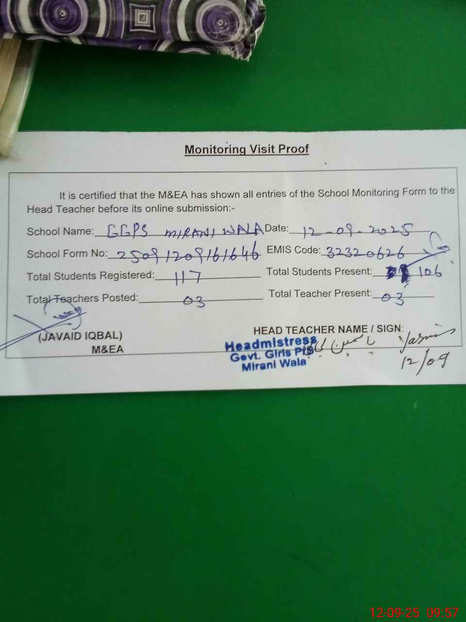 | Monitoring Date: 12-09-2025 | Start Time: 12-09-2025 09:16 AM | End Time: 12-09-2025 09:57 AM | Name of MEA: JA**** IQ**** | |