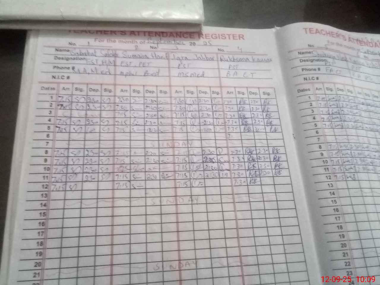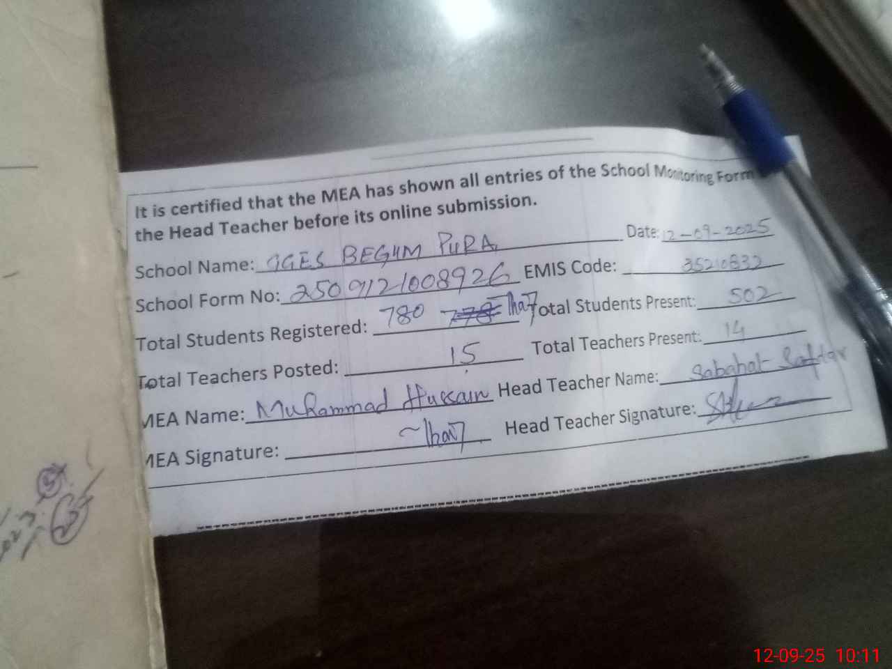 | Remarks (Use Separate Page if Required): 1 Vicky Masih sweeper working in DY DEO W EE office since long time but no furthure order after 29 May 2025 so mark him absent from duty 2 Seven class rooms are under construction but works stop since long time 2017works not completed 3 Due to shortages of class room four sections of classes sitting in varanda on the desk bench and two class sections sitting in under construction building | |||||
