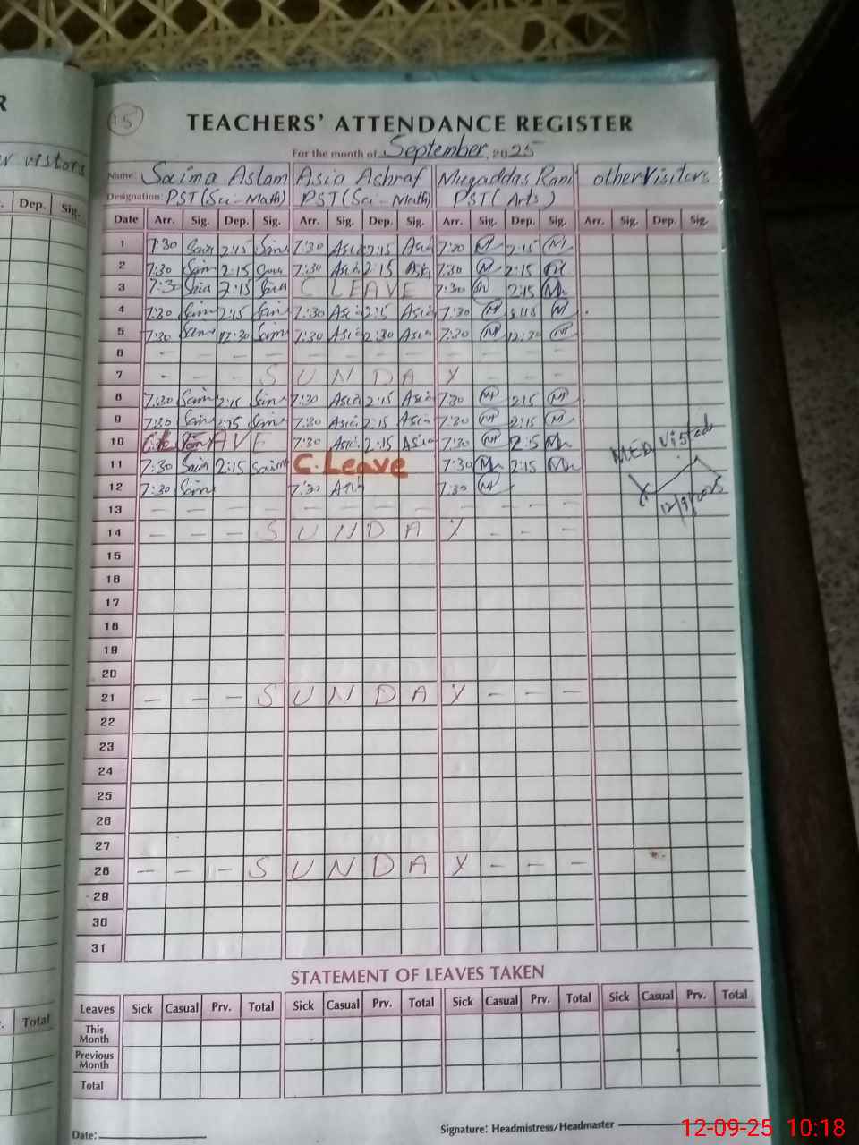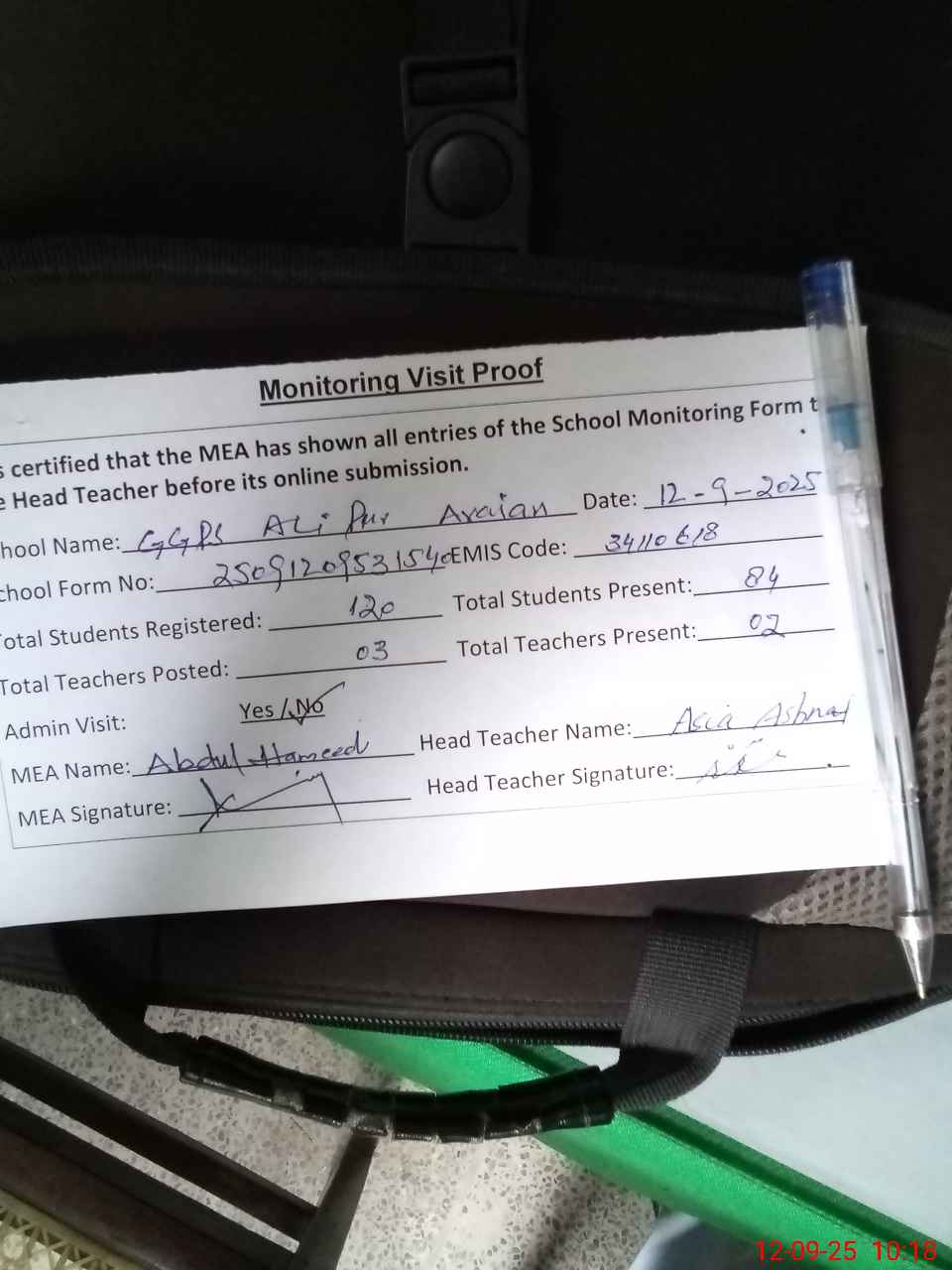 | Remarks (Use Separate Page if Required): Students attendance register un complete from 1st September 2025 Rozenamcha not updated No soap on hand washing point Teachers held mobile phone during the school time Head teacher absent during the school visit Students and Teachers attendance on SIS not found | |||||
