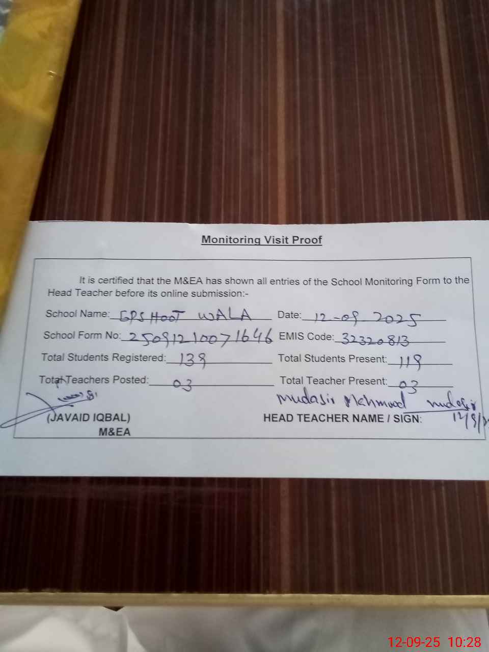 | Attendance Register | Head Teacher | MEA with School | Visit Proof |