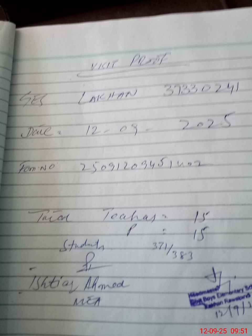 | Attendance Register | Head Teacher | MEA with School | Visit Proof |