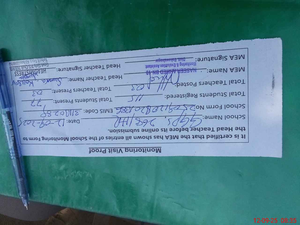 | Attendance Register | Head Teacher | MEA with School | Visit Proof |