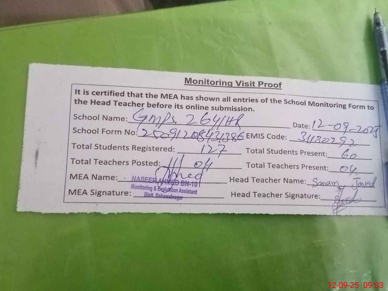 | Attendance Register | Head Teacher | MEA with School | Visit Proof |