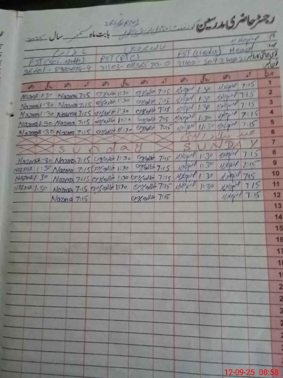 | Name: Sa**** Ja**** Designation: (School Headmaster's/Headmistress's) EST Urdu Phone/Cell Number: 03**** |