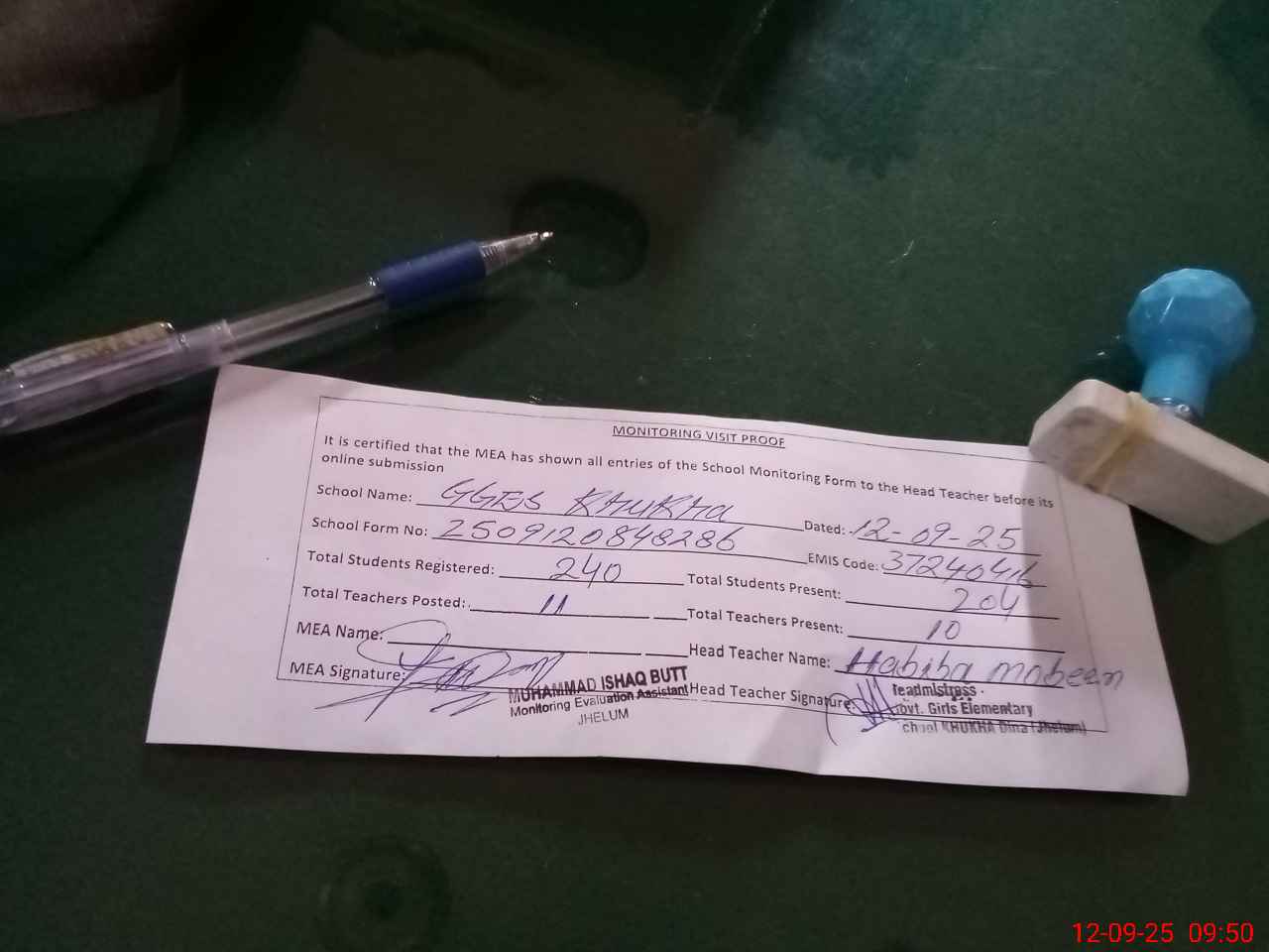 | Certified that this School was Inspected by the Undersigned MEA/DMO Today and the Information Stated Above is as Per Record. | |||||