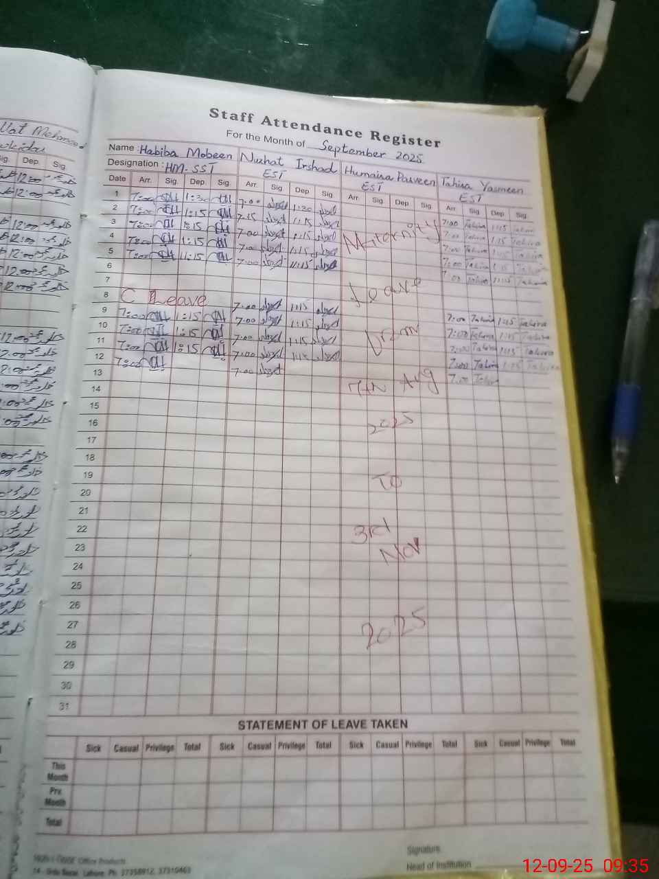 | Leave | Duty | Absent | Maternity | Medical | Ex- Pak |