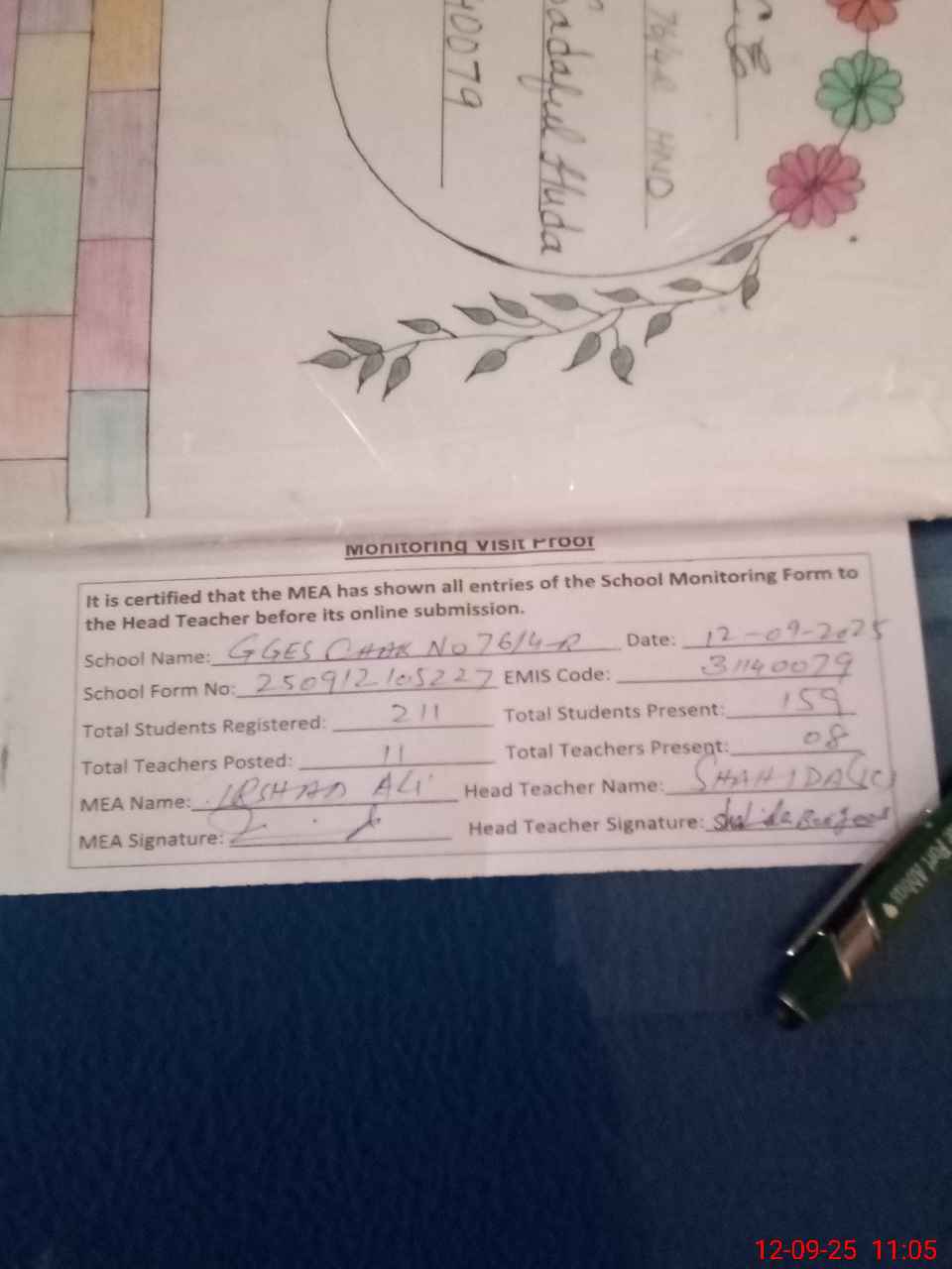 | Attendance Register | Head Teacher | MEA with School | Visit Proof |