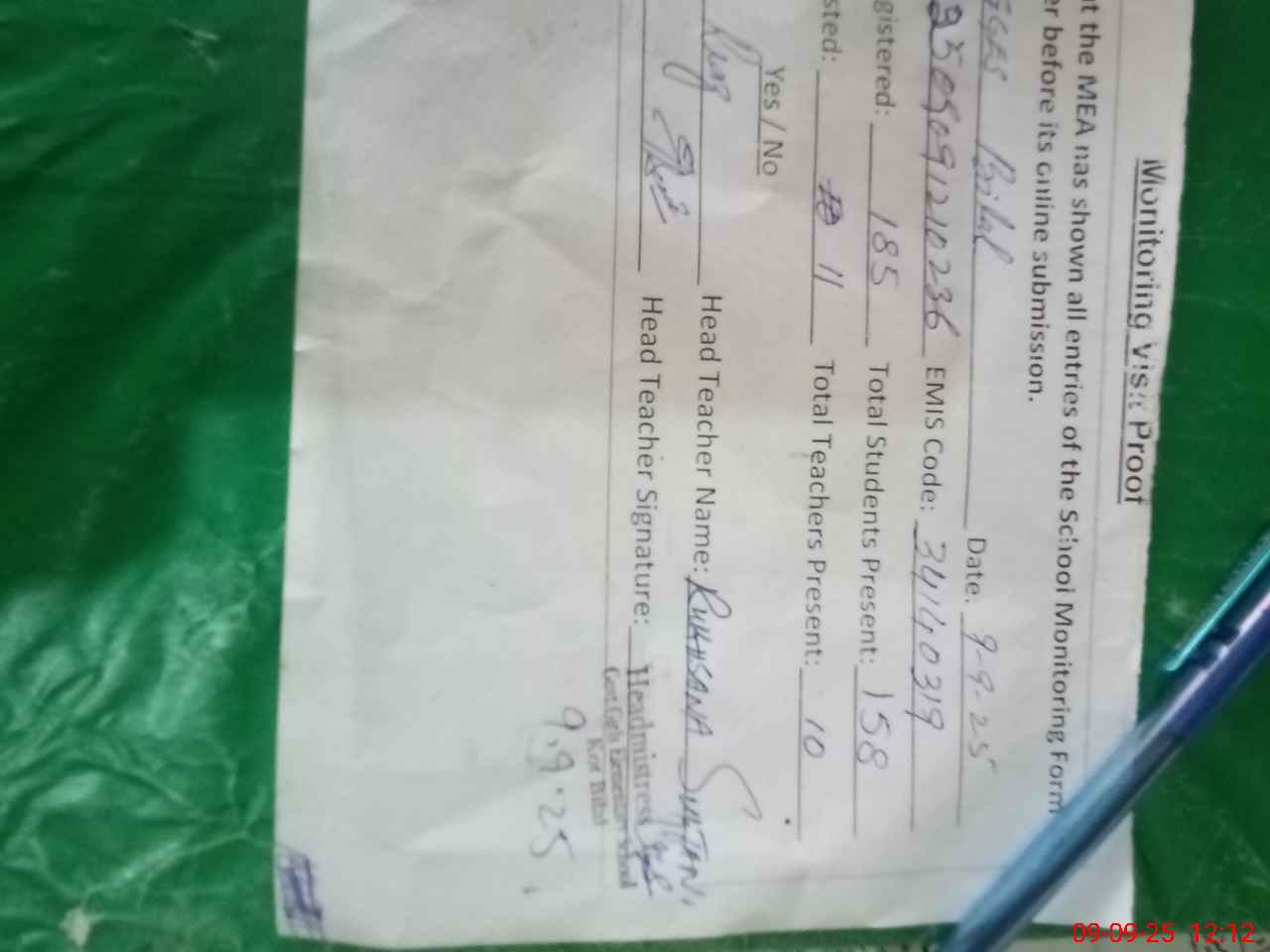 | Attendance Register | Head Teacher | MEA with School | Visit Proof |