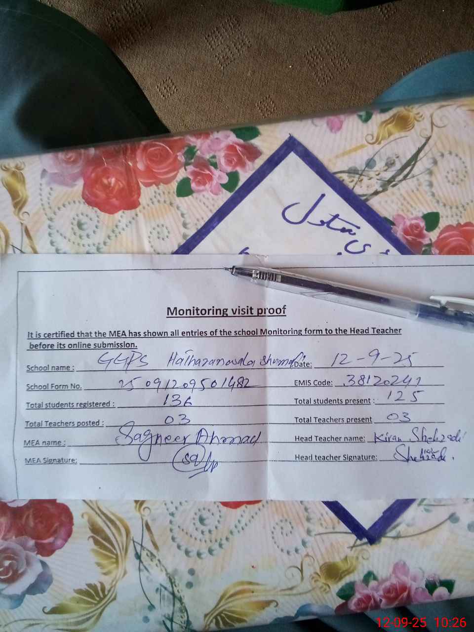 | Attendance Register | Head Teacher | MEA with School | Visit Proof |