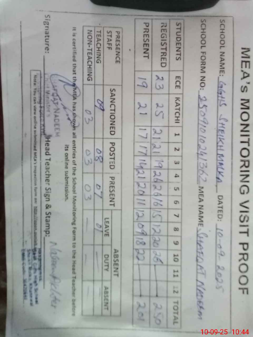 | Attendance Register | Head Teacher | MEA with School | Visit Proof |