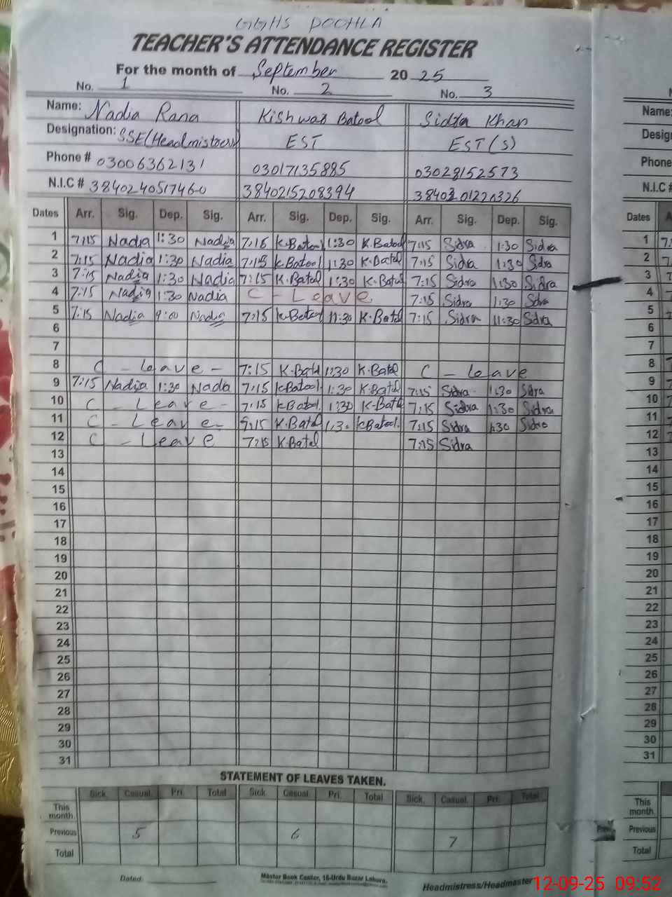 | CNIC | Full Name | Designation | R/C | Absence During Last Calender Month |