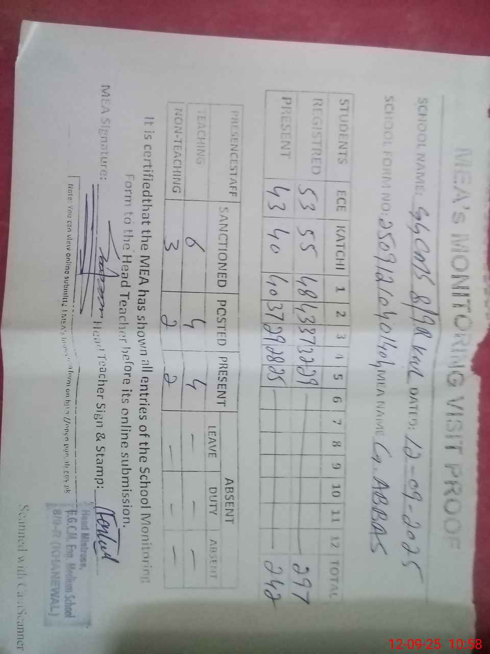 | Attendance Register | Head Teacher | MEA with School | Visit Proof |