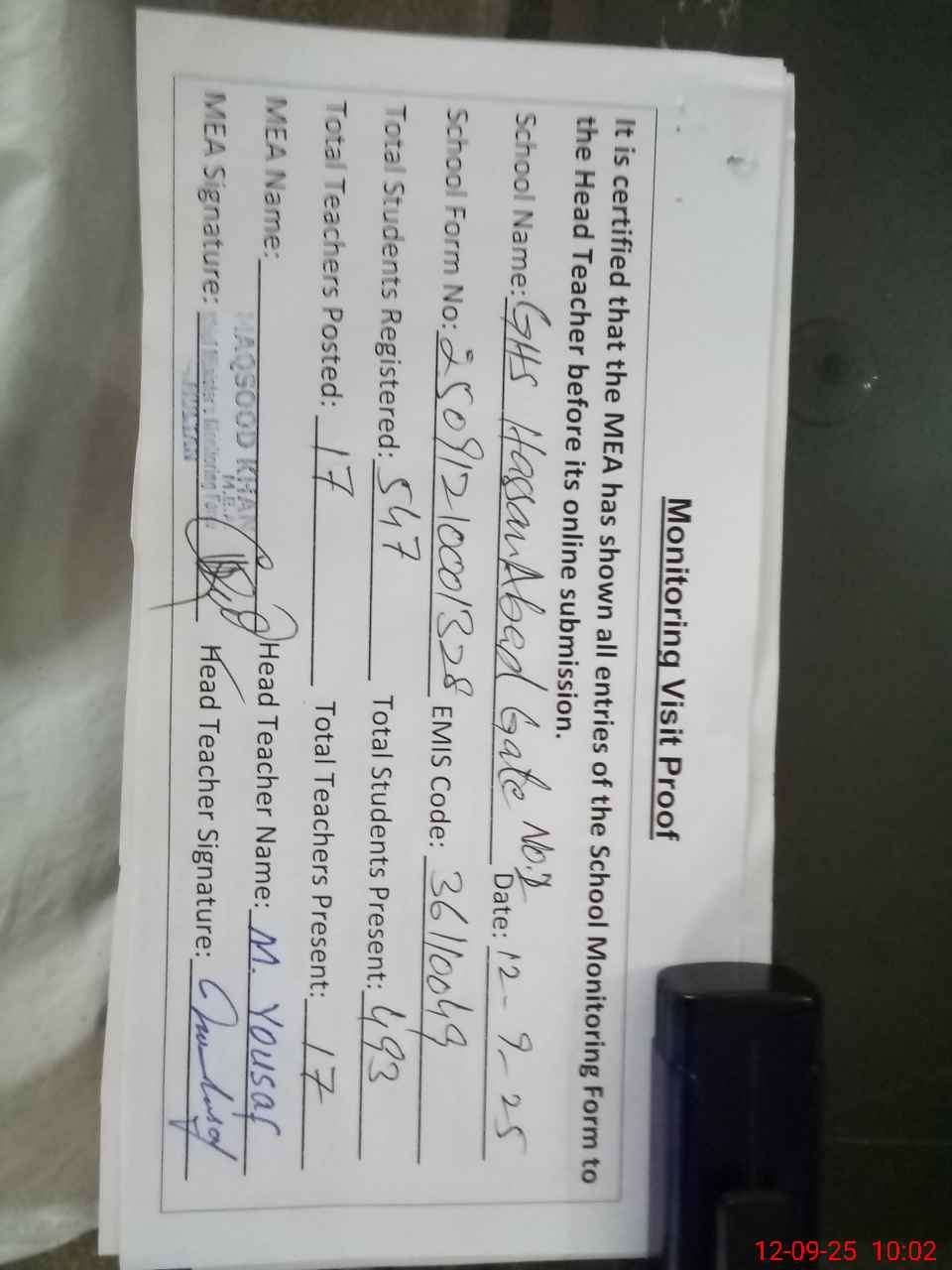 | Attendance Register | Head Teacher | MEA with School | Visit Proof |