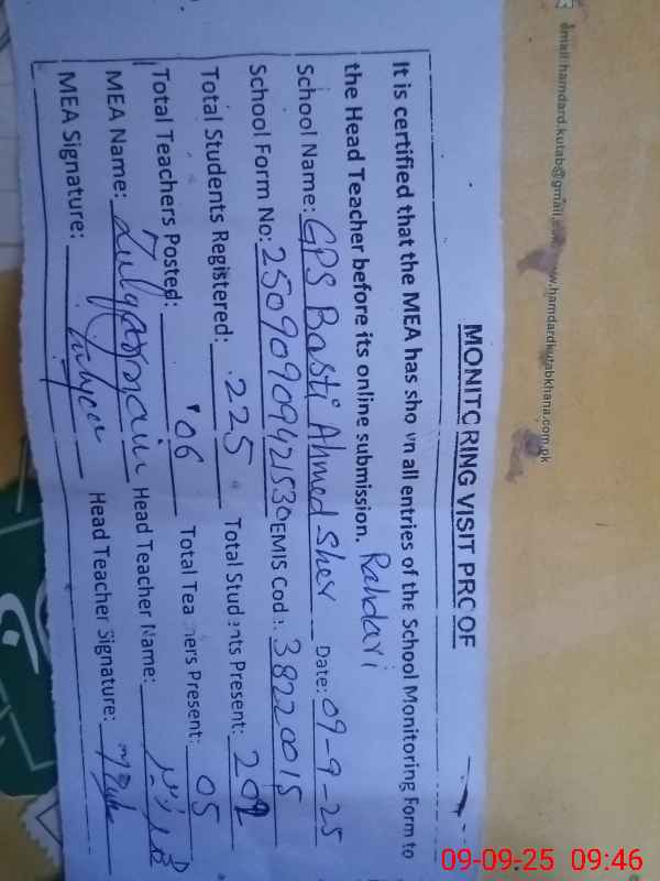 | EMIS Code: 38220015 | Name of School: GPS BASTI AHMED SHER RAHDARI | |||
