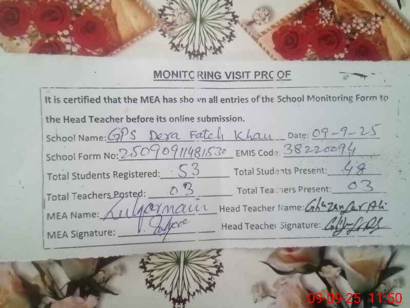 | EMIS Code: 38220094 | Name of School: GPS DERA FATEH KHAN | |||