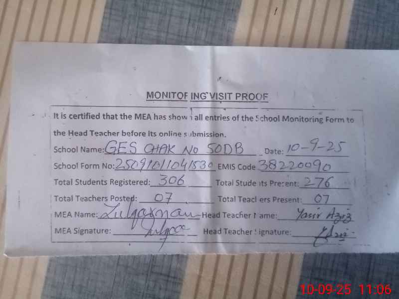 | EMIS Code: 38220090 | Name of School: GES CHAK NO. 50/DB | |||