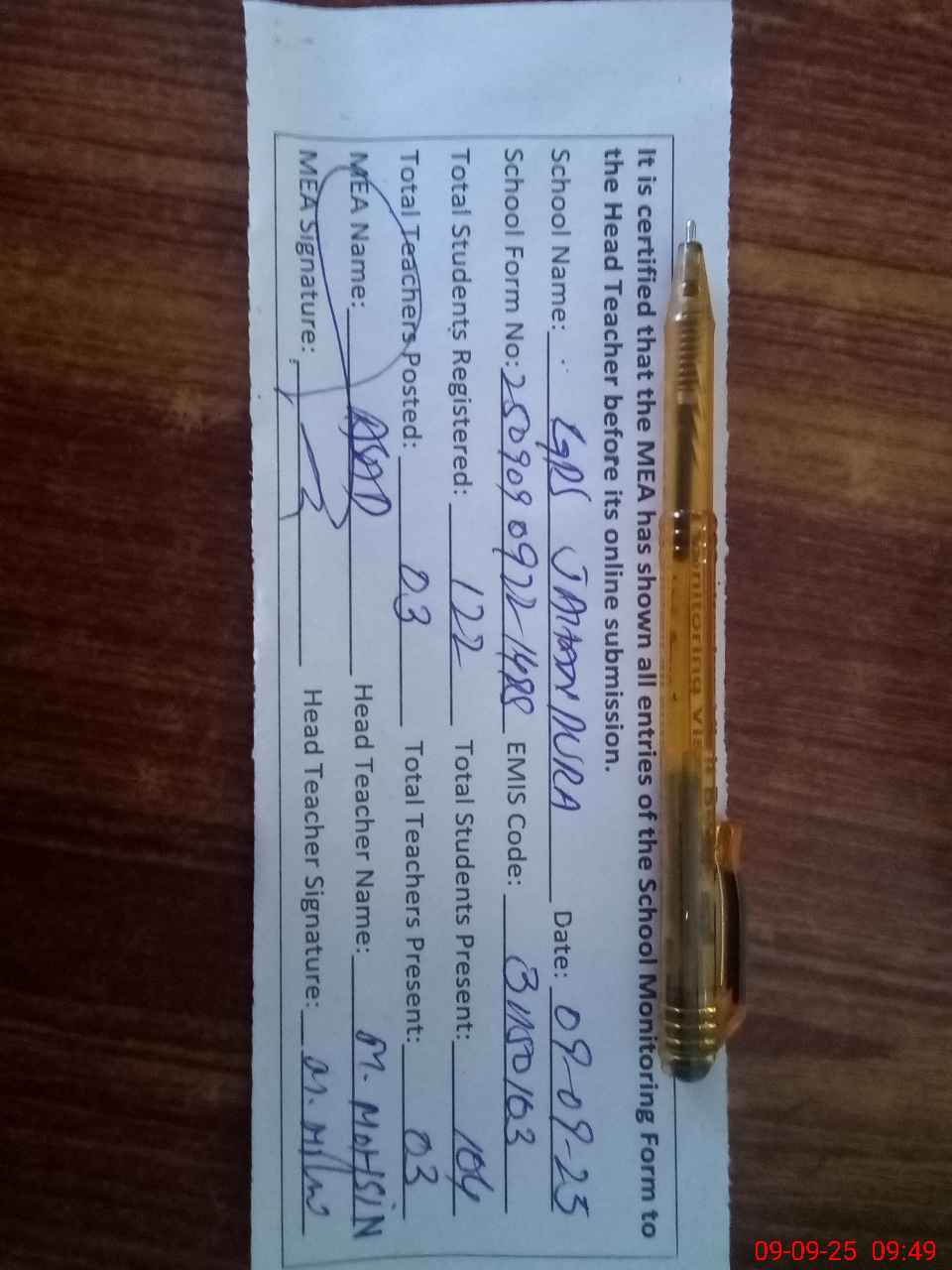 | Certified that this School was Inspected by the Undersigned MEA/DMO Today and the Information Stated Above is as Per Record. | |||||