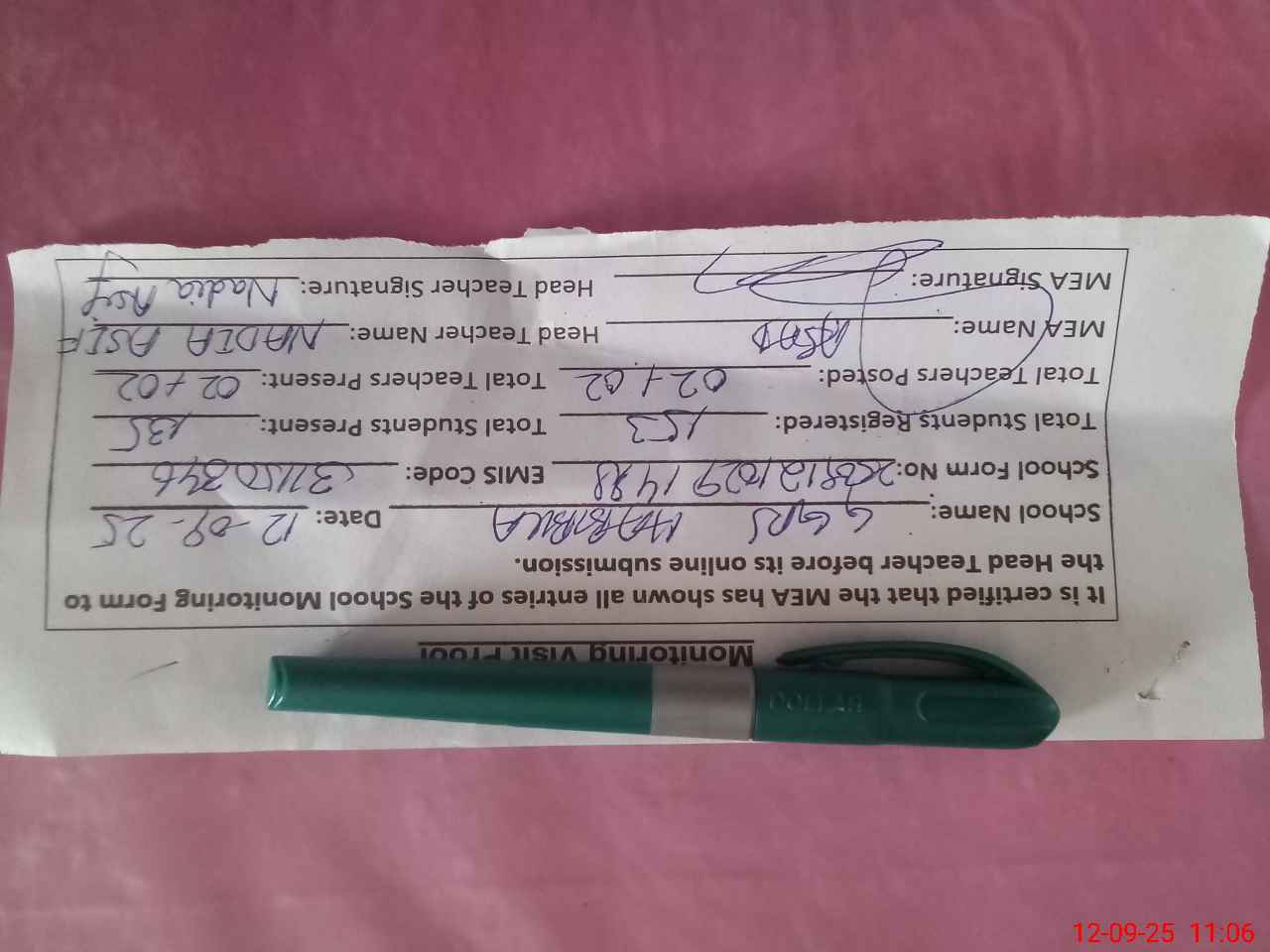 | Attendance Register | Head Teacher | MEA with School | Visit Proof |
