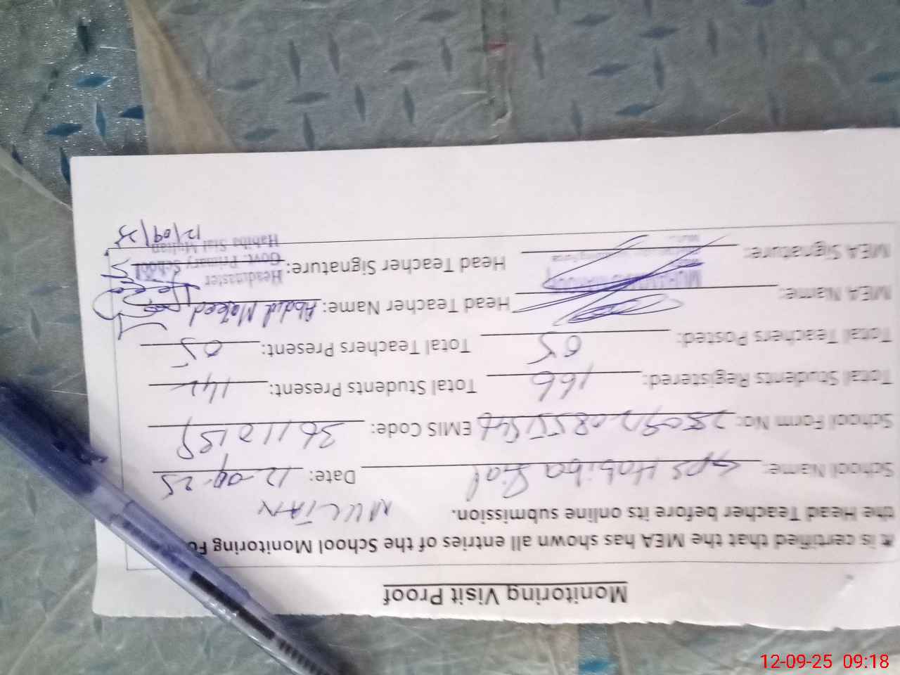 | Attendance Register | Head Teacher | MEA with School | Visit Proof |