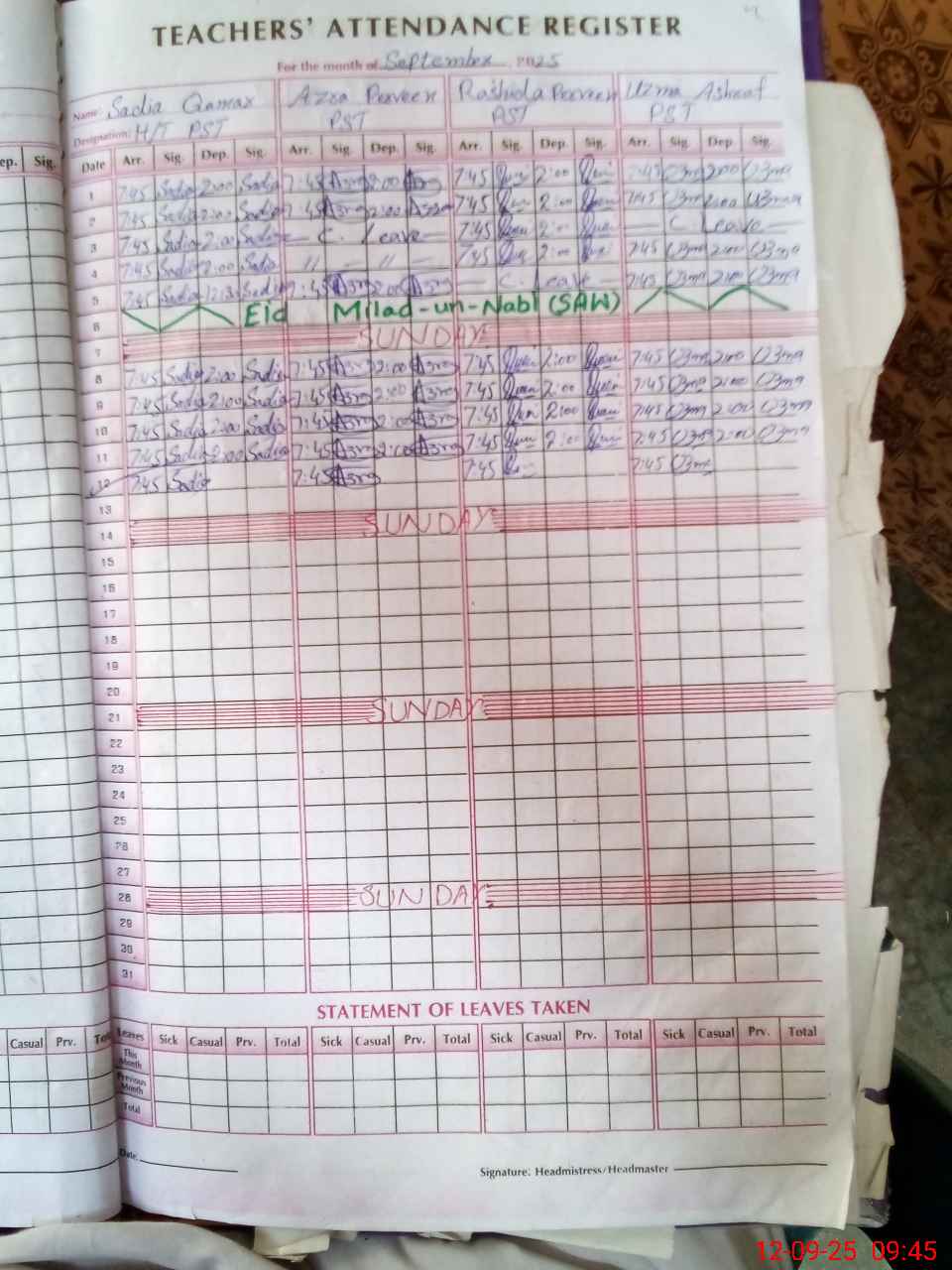 | Remarks (Use Separate Page if Required): School have two building and both are in use PST ARFA NAVEED IS ON OTHER DUTY in FG SCHOOL SINCE 03 JULY 2023 TO DATE | |||||