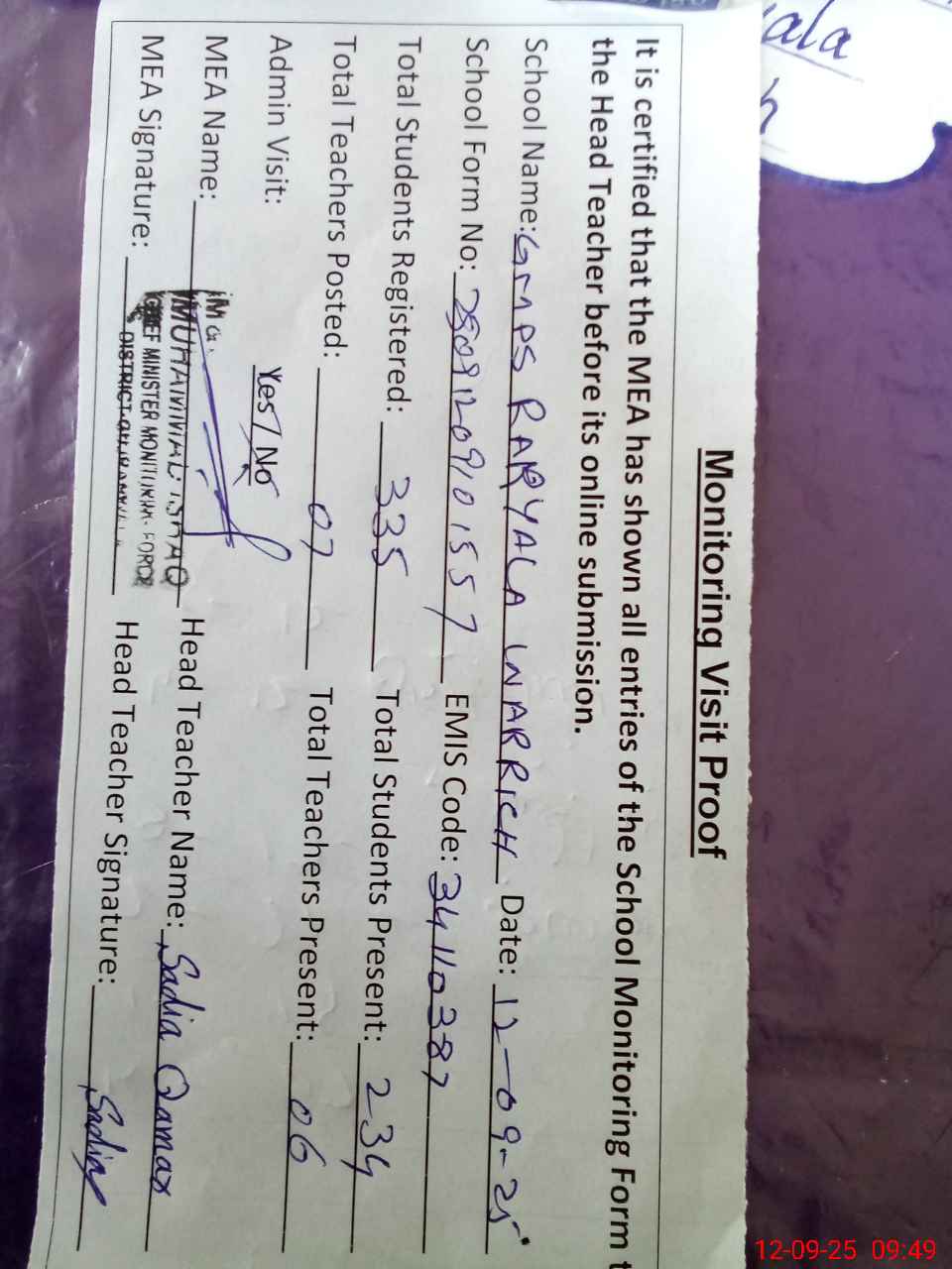 | EMIS Code: 34110387 | Name of School: GMPS RARYALA WARRICH | |||